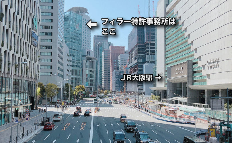 フィラー特許事務所のオフィスは、JR大阪駅南改札口を出て国道2号線を渡り右手に約100mほど歩いた所にあるヒルトンプラザウエストタワーの19階にあります。